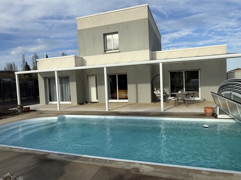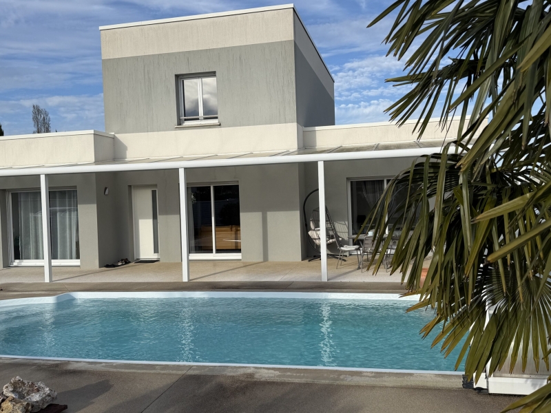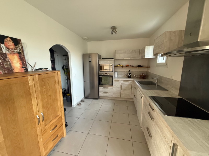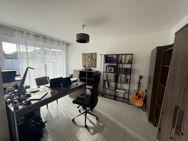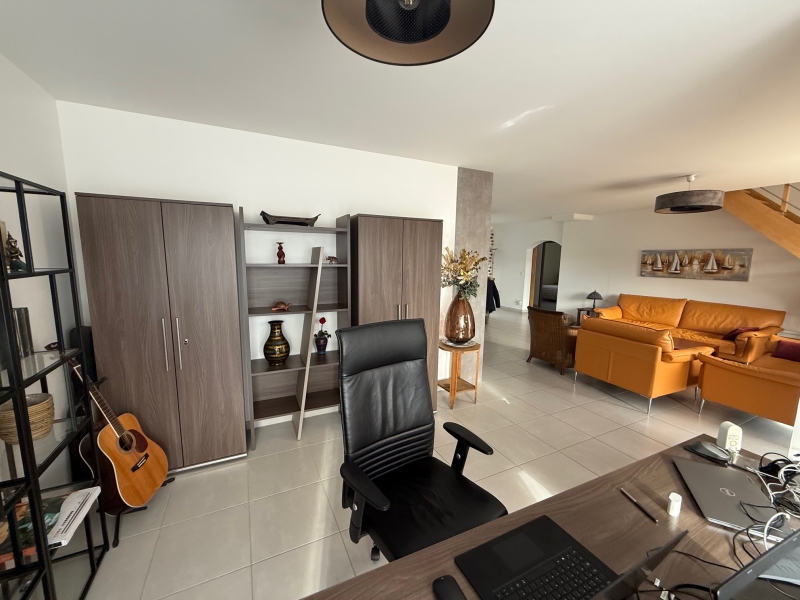 Superbe maison contemporaine Calme, confort et prestations de qualité Construite en 2014, cette magnifique maison contemporaine vous séduira par son environnement privilégié, situé dans un quartier particulièrement calme et verdoyant, à proximité immédiate des commerces. De plain-pied, vous découvrirez une belle entrée ouverte sur une vaste pièce de vie lumineuse comprenant une cuisine aménagée et équipée, prolongée par une arrière-cuisine fonctionnelle. L’espace de vie se compose également d’un salon-séjour convivial ainsi que d’un bureau.