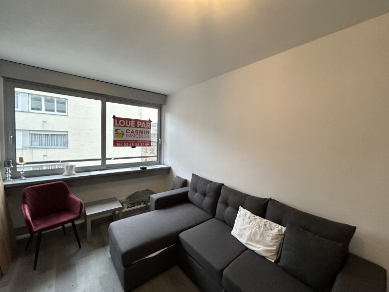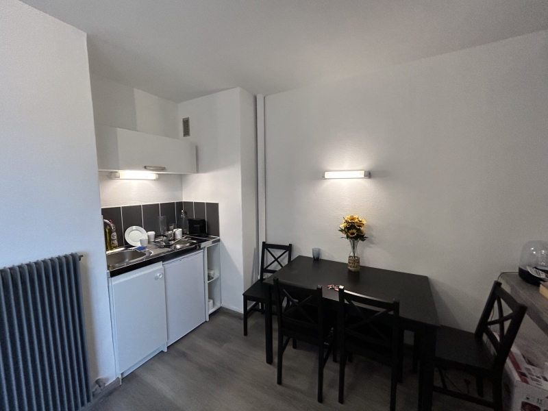 Bourges, centre ville, à louer dans une résidence sécurisé avec ascenseur, studio comprenant entrée avec un placard, salle d’eau avec WC et machine à laver, une pièce de vie avec un espace cuisine équipé d’un frigo et plaques de cuisson, canapé lit, table et chaises. Loyer 350€ + 130€ provision sur charges (eau chaude, eau froide, chauffage), frais d’agence 285,78€ dont 77,94 € d’état des lieux, Carmin immobilier 02 48 24 37 09.